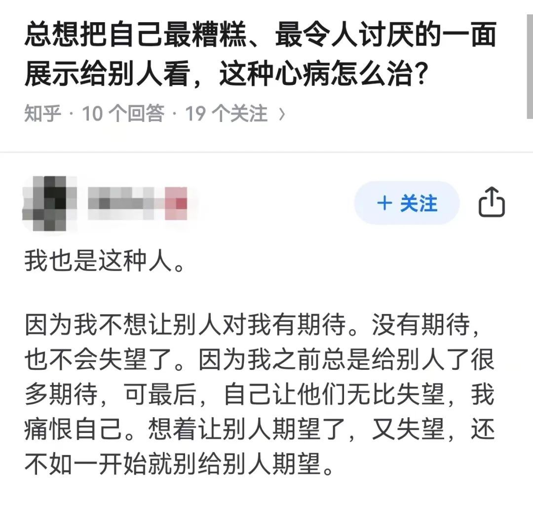 设想自己从一开始就不让别人产生期望,所以一言一行,都故意让别人失望,于是别人总是看到自己糟糕的一面。