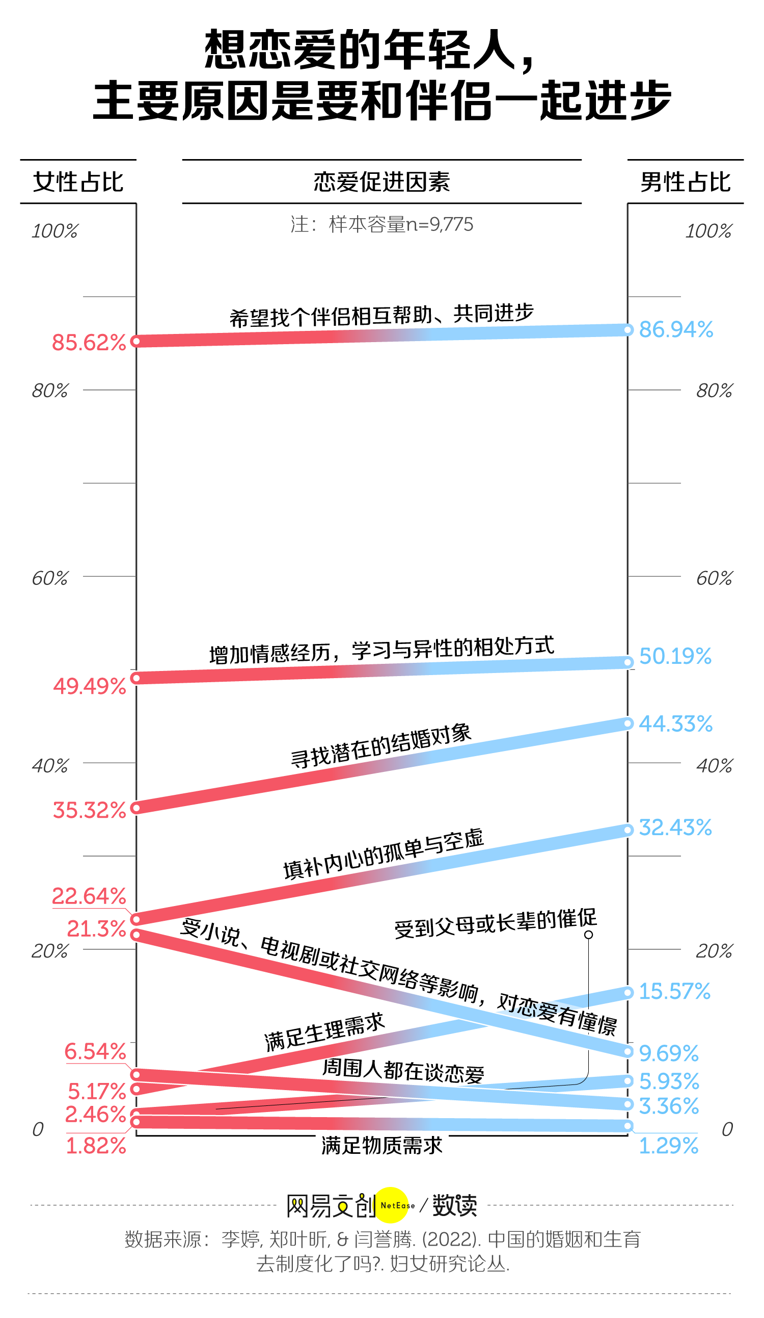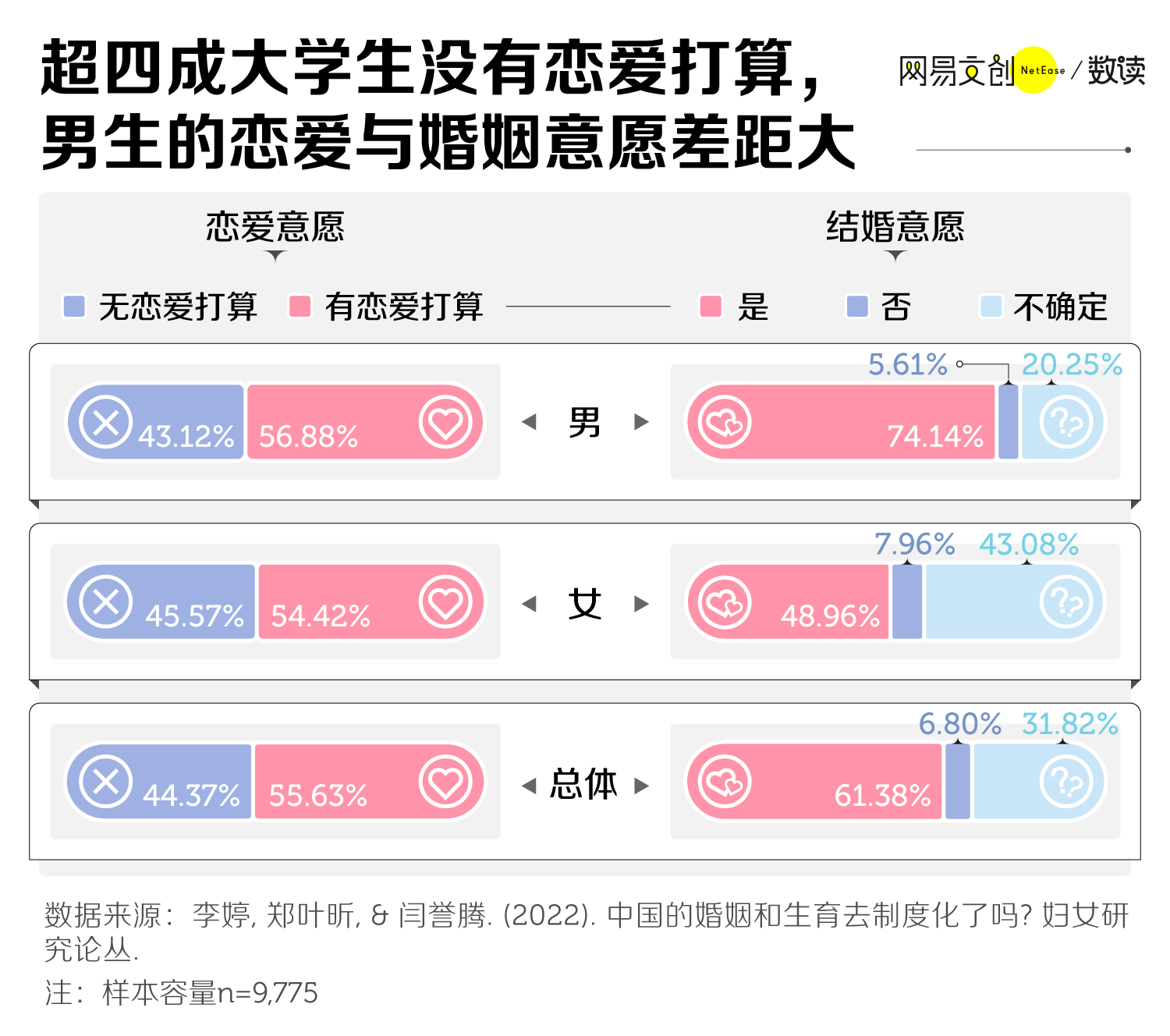 2021 年,中国人民大学有项研究调查了全国 22 个省份、共 9775 个大学生的婚育观,发现超过四成的大学生都没有恋爱的打算 [3]。