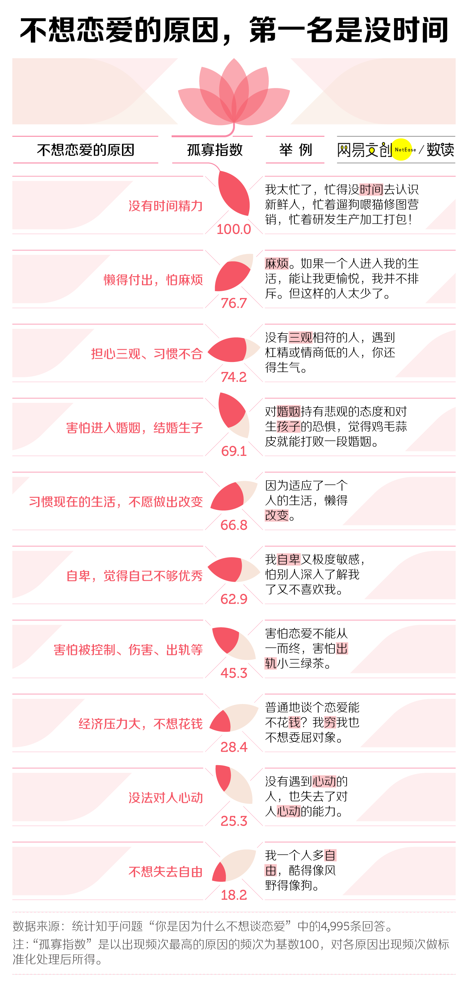 大学生是如此,那年轻的职场社畜们又如何呢?我们统计了知乎问题“你是因为什么不想谈恋爱?”中的 4995 条回答,得出了类似的结论。