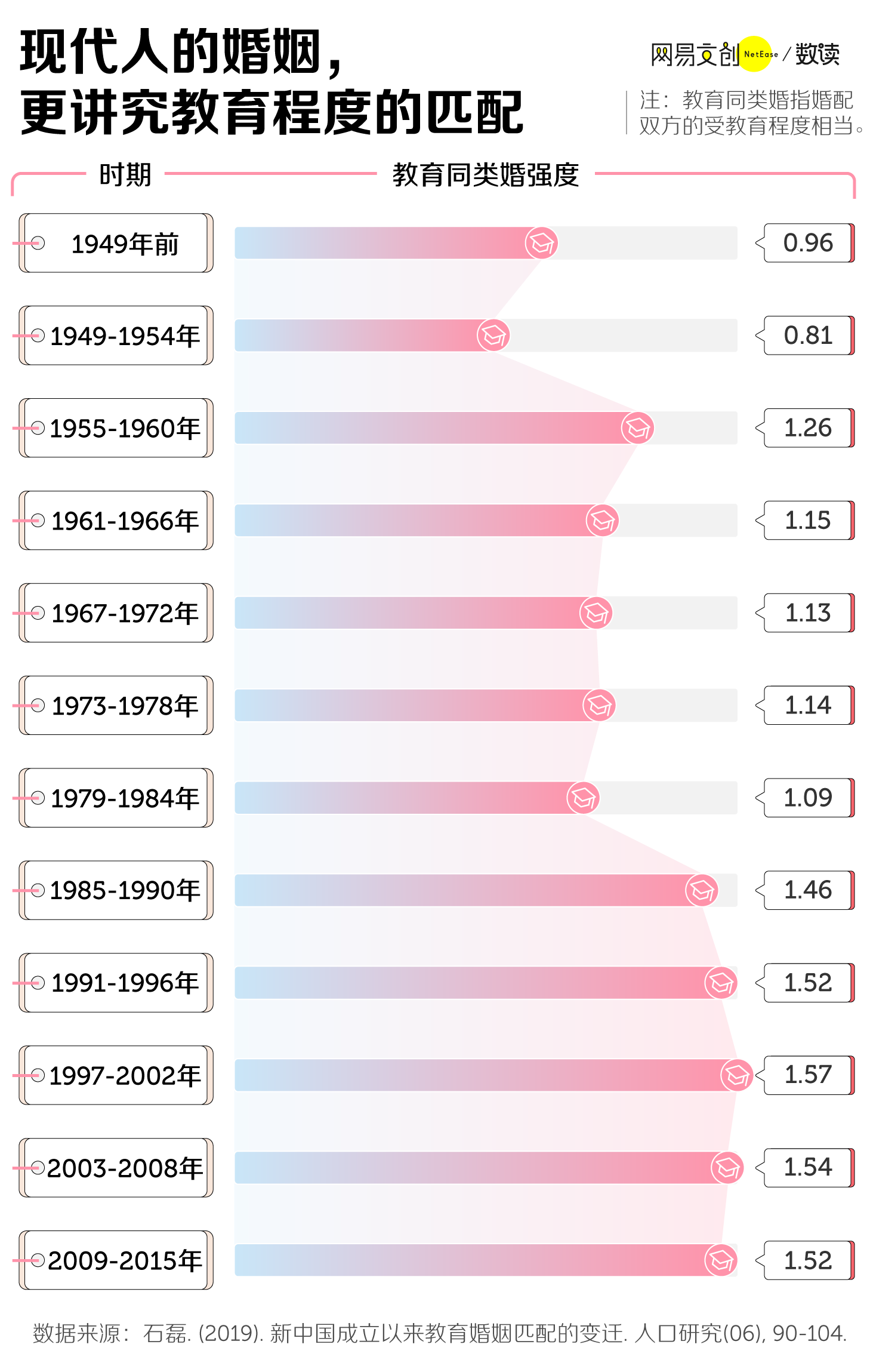根据一项对教育同类婚的研究,和改革开放前相比,现在年轻人的婚姻反而更讲究要教育水平相当,也就是所谓的“门当户对” [7]。
